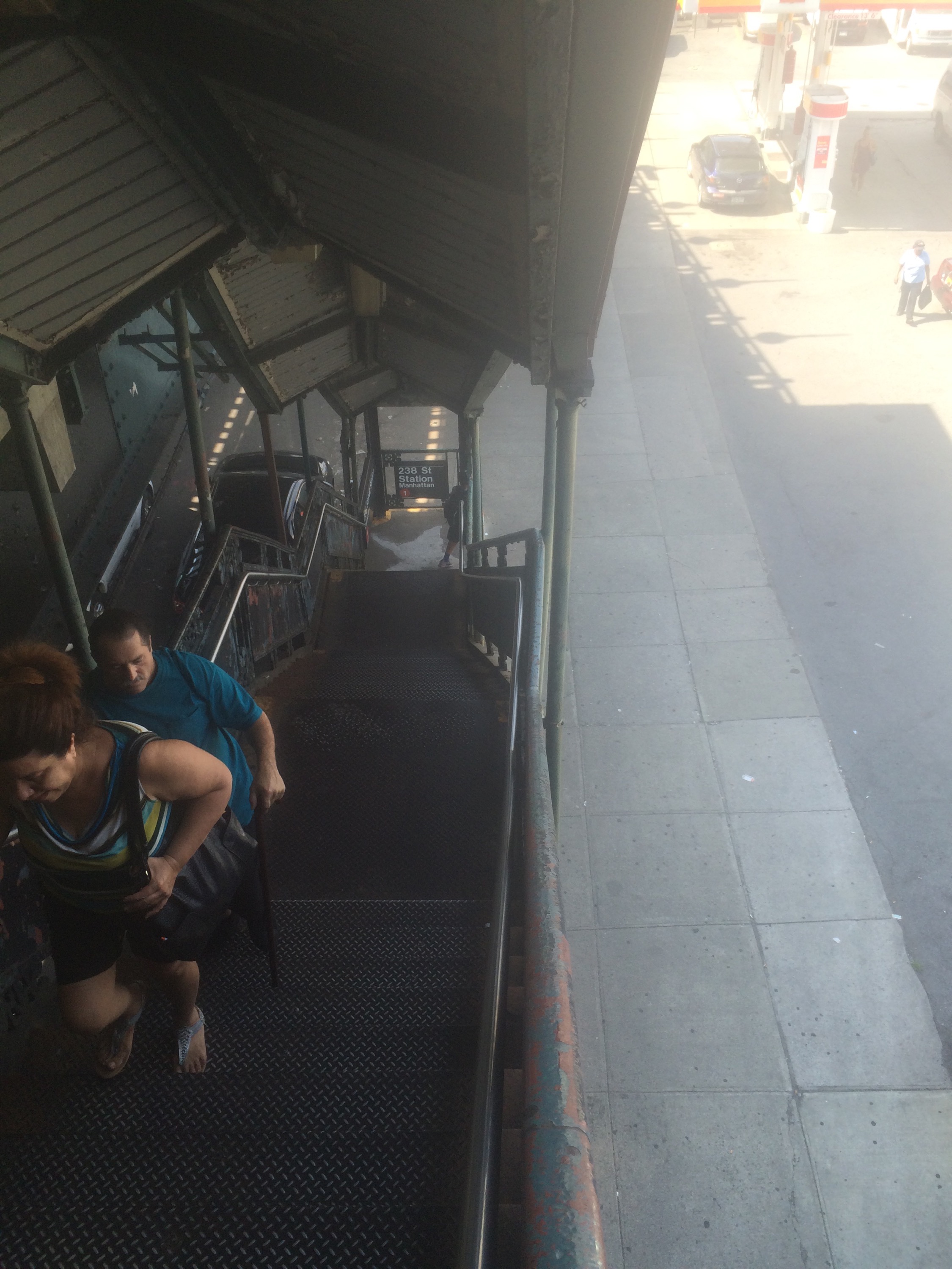 Yet they were having a very difficult time walking up what is essentially two flights of stairs this morning. There’s no elevator at this 238th St. station. The 231st Street station, which does have one, is 7 blocks away. The 238th St. station needs an elevator. What can people with any kind of walking difficulty do if they need to get downtown in a timely manner? If you have other thoughts/ideas, please share.
