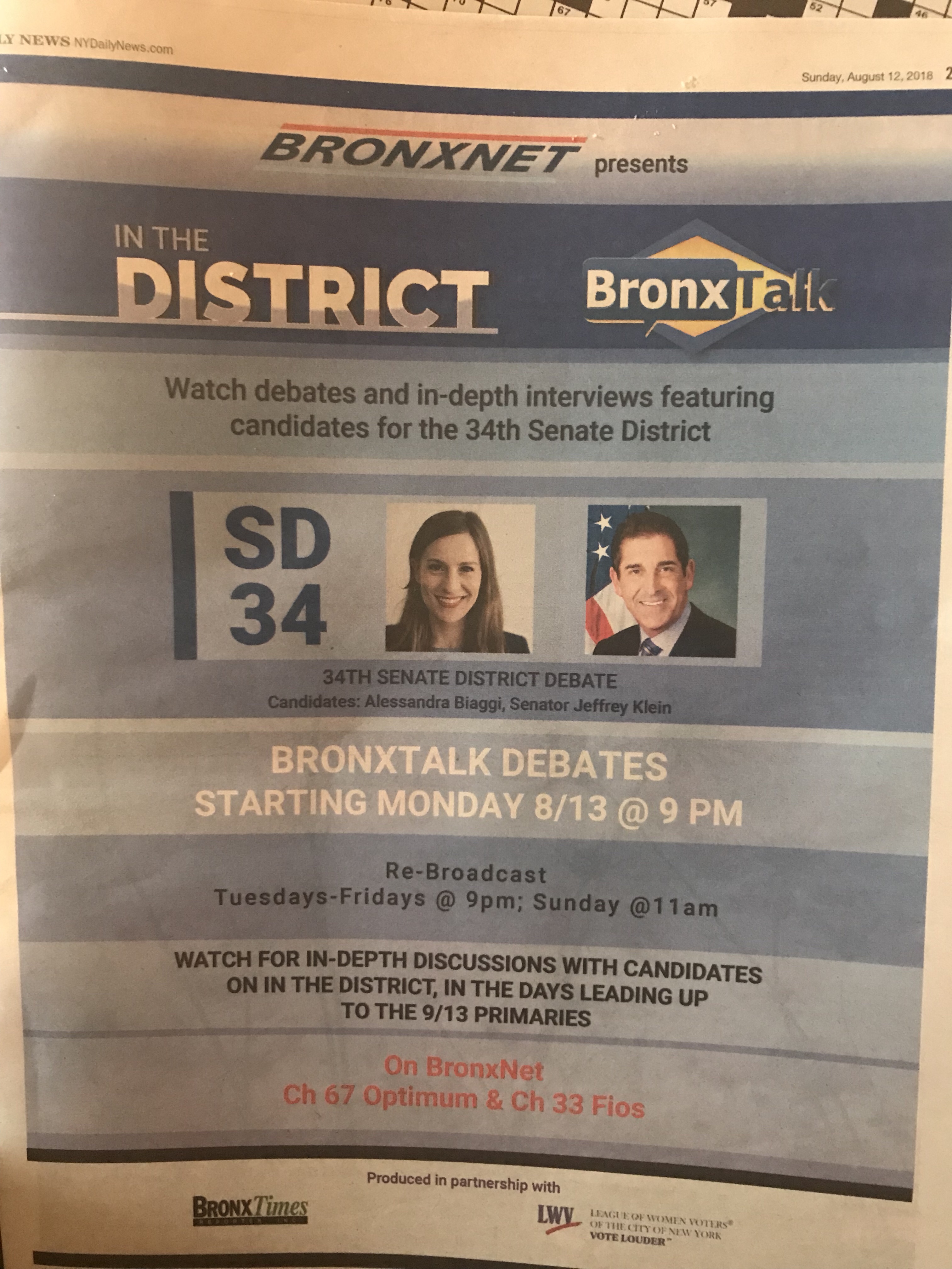 Well, watch tonight’s BronxTalk debate, hosted by Gary Axelbank, between state Senate candidates Jeff Klein and Alessandra Biaggi! at 9 p.m. on BRONXNET – Cablevision channel 67 or Fios channel 33 (will be aired again through Friday at 9 p.m. and Sunday at 11 a.m.) Here’s an advertisement for the debate in the Daily News today.