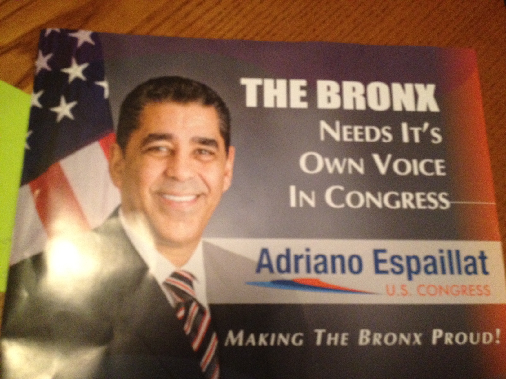 21 JunThe mailings many of us Bronxites living in the new 13th Congressional District received yesterday would appear to most voters that they were from Adriano Espaillat (and that’s the way they appeared to me initially). But when you look at the fine print you see that they’re the work of the Latino Empowerment PAC, a Super PAC that by law should have no connection with Espaillat, a state senator seeking to unseat Congressman Charles Rangel in a newly drawn district that includes a large chunk of the northwest Bronx. There’s no evidence that there is a connection with Espaillat, and the closer you look at them the more disappointed the candidate is likely to be that they were sent out with his name and face on them.