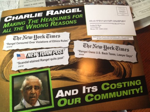 The above mailer with the missing apostrophe and attacking incumbent Rangel is also the work of the Latino Empowerment PAC. They’re listed on web sites tracking campaign financing with Jeffrey Garcia as the Treasurer. A Huffington Post report on recent Super PAC registrations indicates that Garcia and the PAC are from Coral Gables, Florida. We’ll let you know if we learn anything else about this. (And let us know if you do.) And don’t forget that the primary election is next Tuesday, June 26.