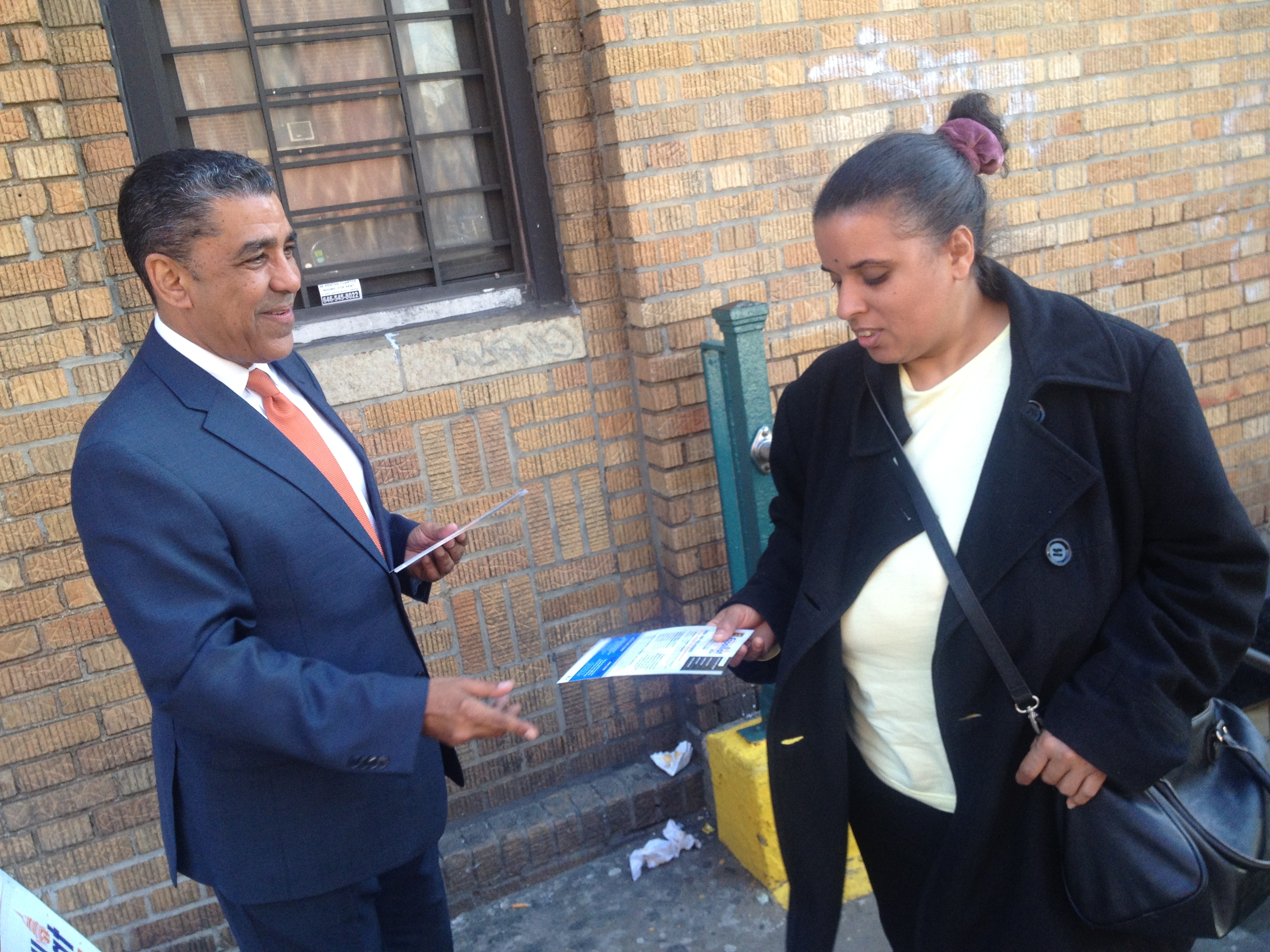 Adriano Espaillat campaigned outside the D-train station on East 196th Street and the Grand Concourse last month. Longtime congressman Charlie Rangel didn’t accompany him at the BronxTalk debate today. Photo by J. Moss